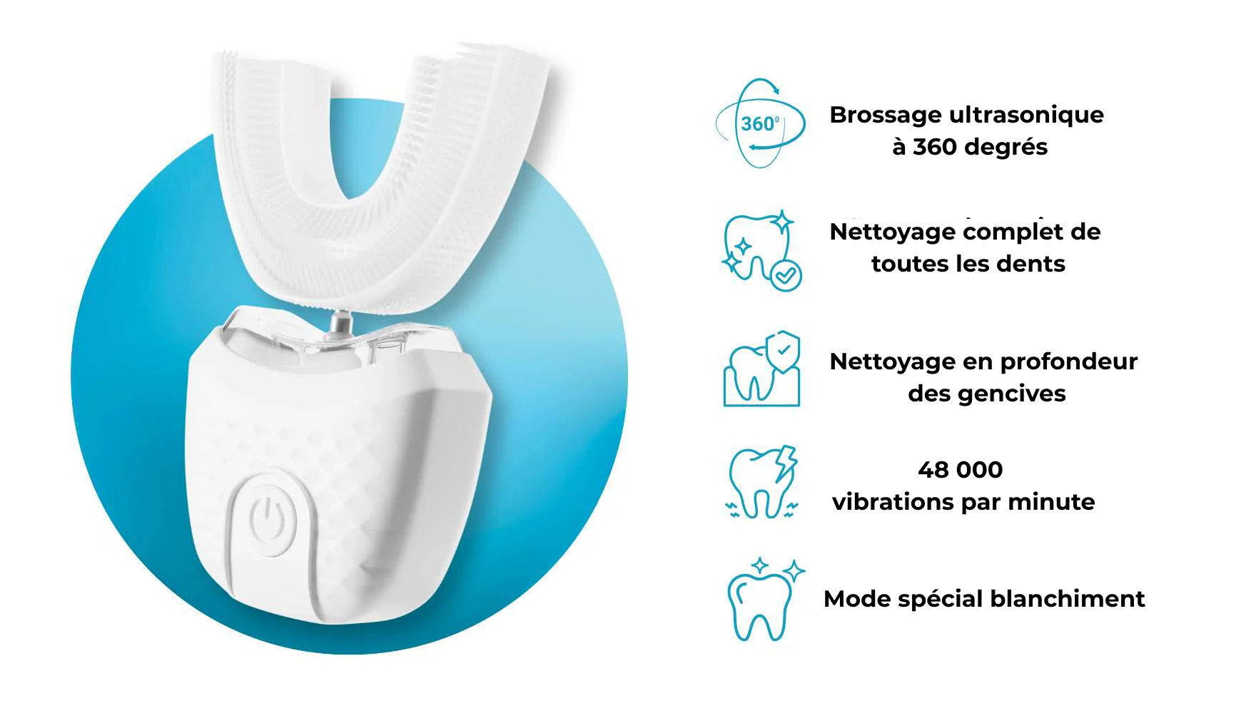 Grâce à son embout en U et à ses vibrations haute fréquence (jusqu’à 300 fois par minute), elle couvre toutes les dents simultanément, avec un angle et une intensité constants. En réalité, ces 30 secondes sont optimisées pour un nettoyage uniforme et complet, et suffisent largement selon les normes d’hygiène bucco-dentaire.